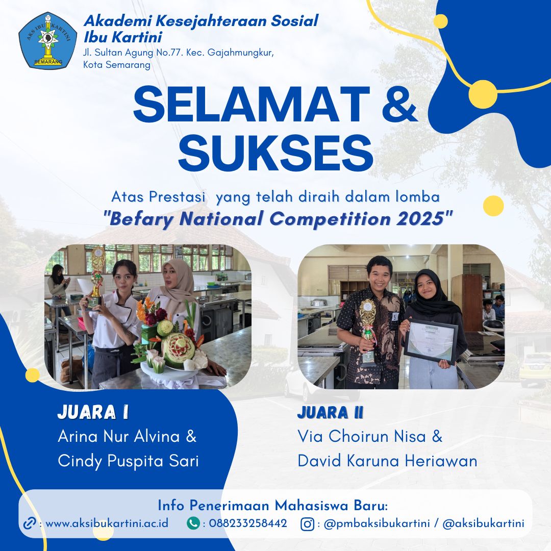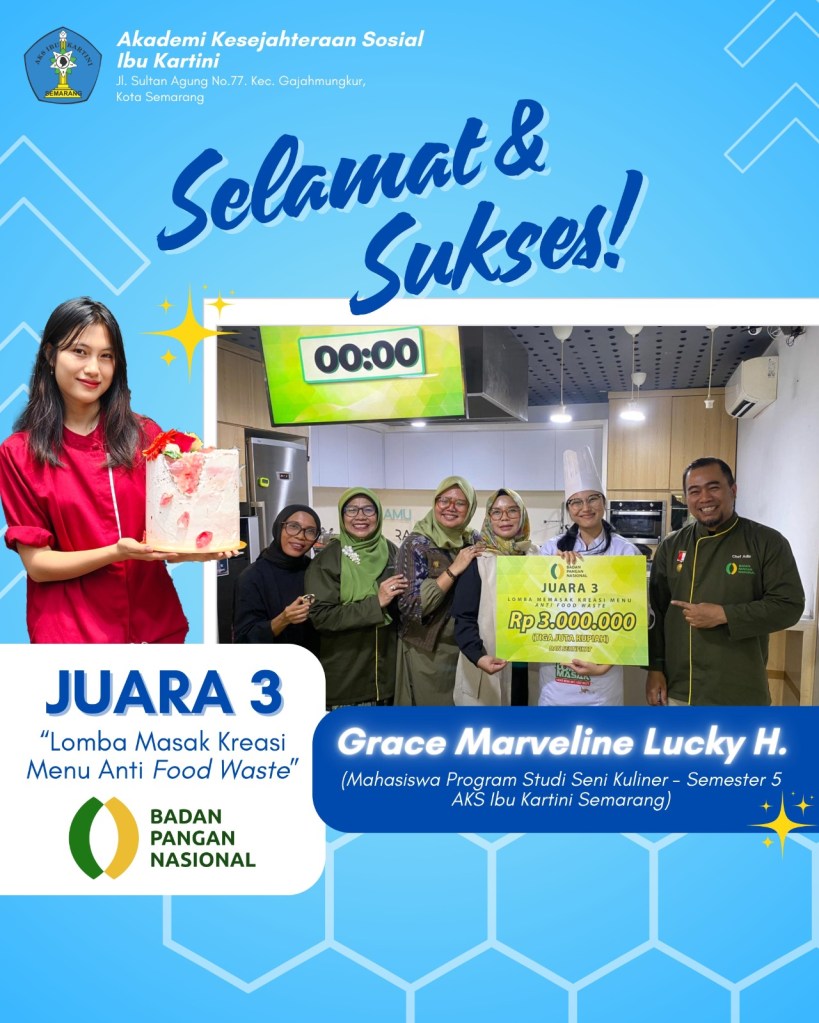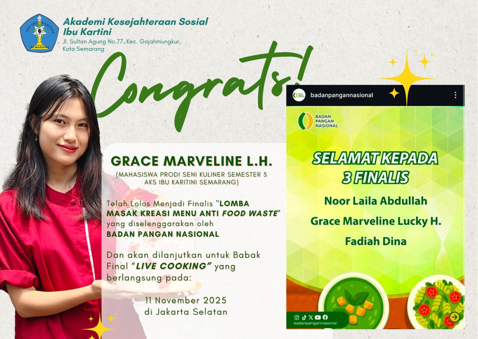Segenap civitas akademik Akademi Kesejahateraan Sosial Ibu Kartini mengucapkan Selamat kepada Grace Marveline Lucky H. dari Prodi Seni Kuliner yang telah lolos menjadi Finalis “Lomba Masak Kreasi Menu Anti Food Waste“.