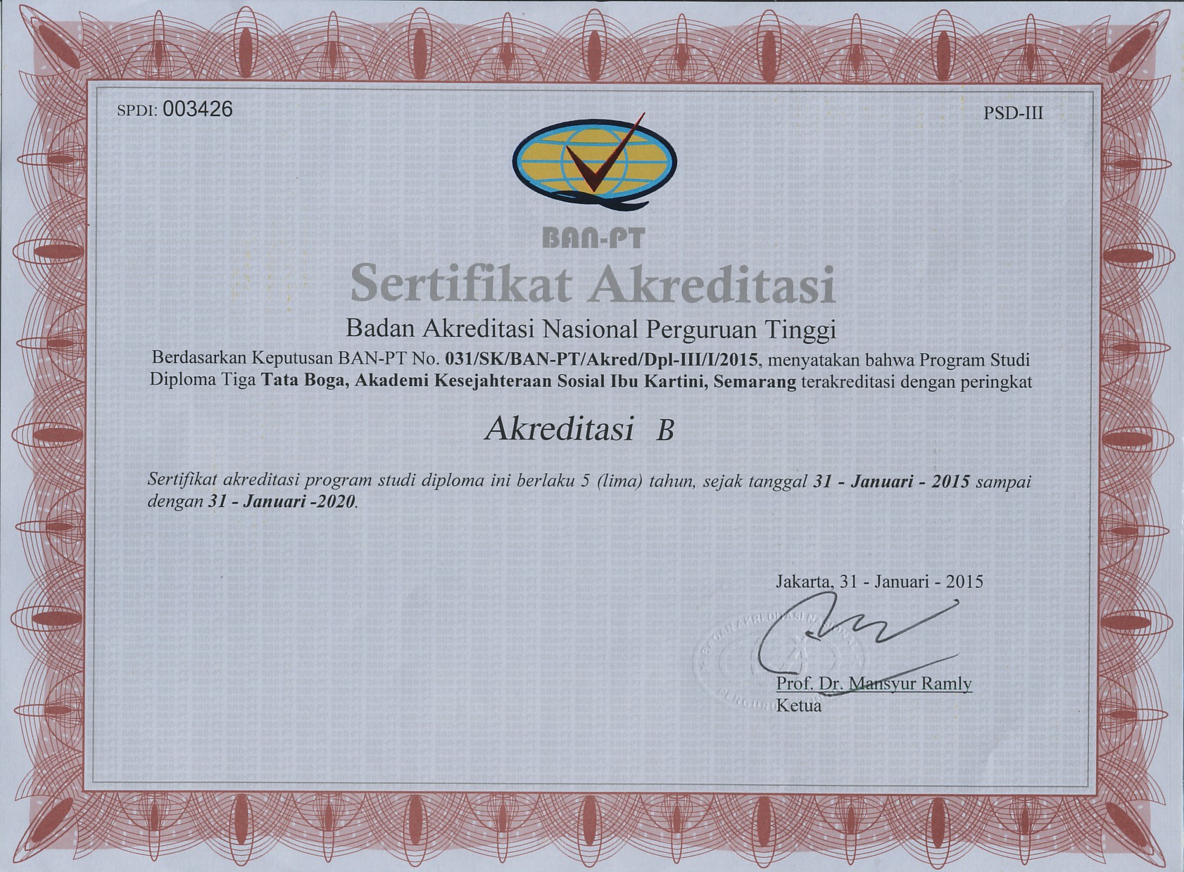 Download SERTIFIKAT Akreditasi Prodi Tata Boga No. 031/SK/BAN-PT/Akred/Dpl-III/I/2015