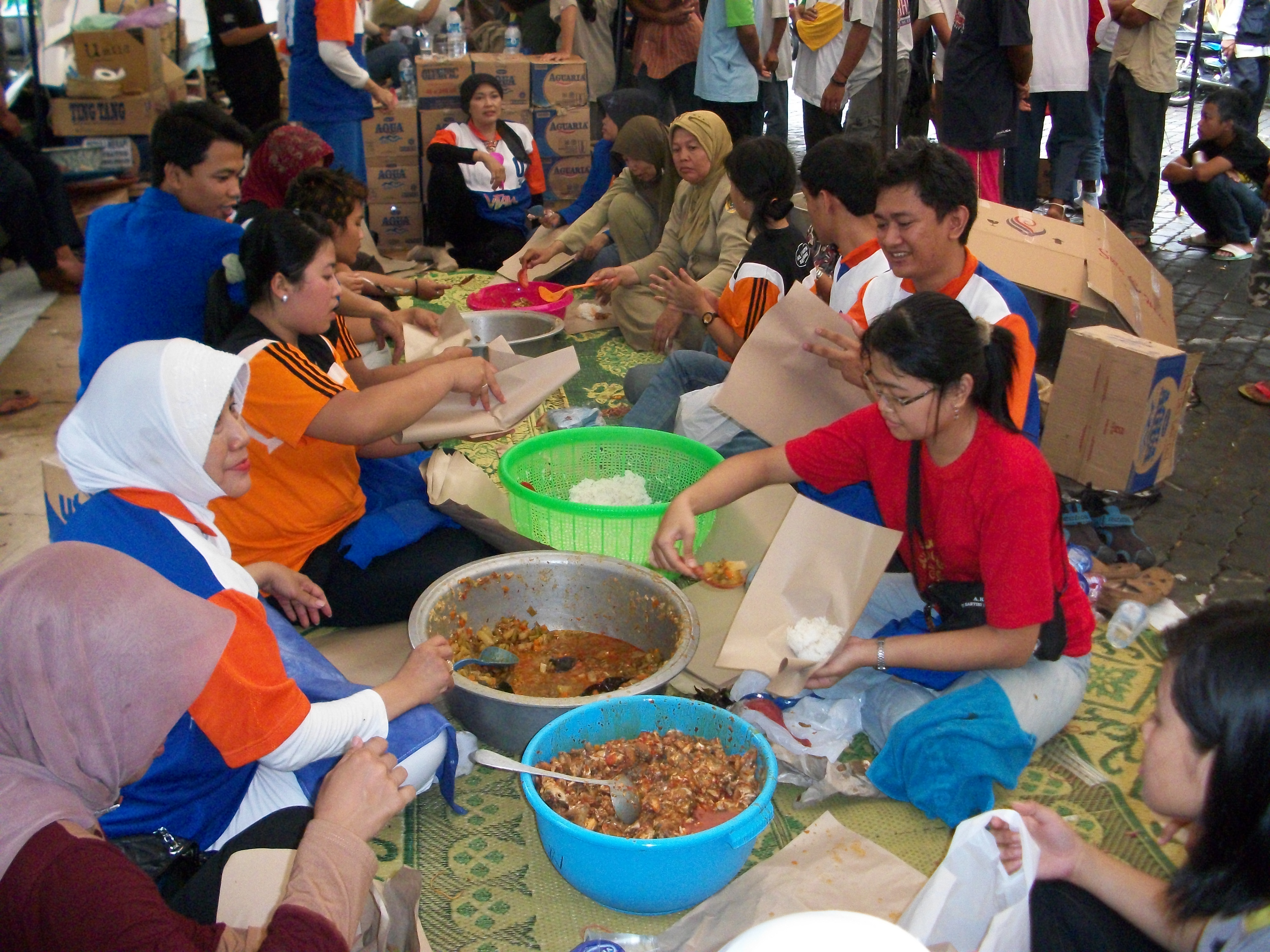 Para pengungsi sedang mengantri untuk mendapatkan sebungkus nasi |