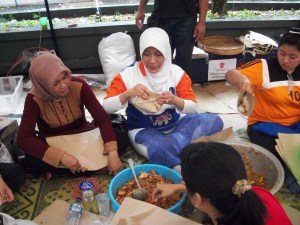Direktur AKS Ibu Kartini Semarang sedang membungkus nasi untuk korban letusan Merapi |