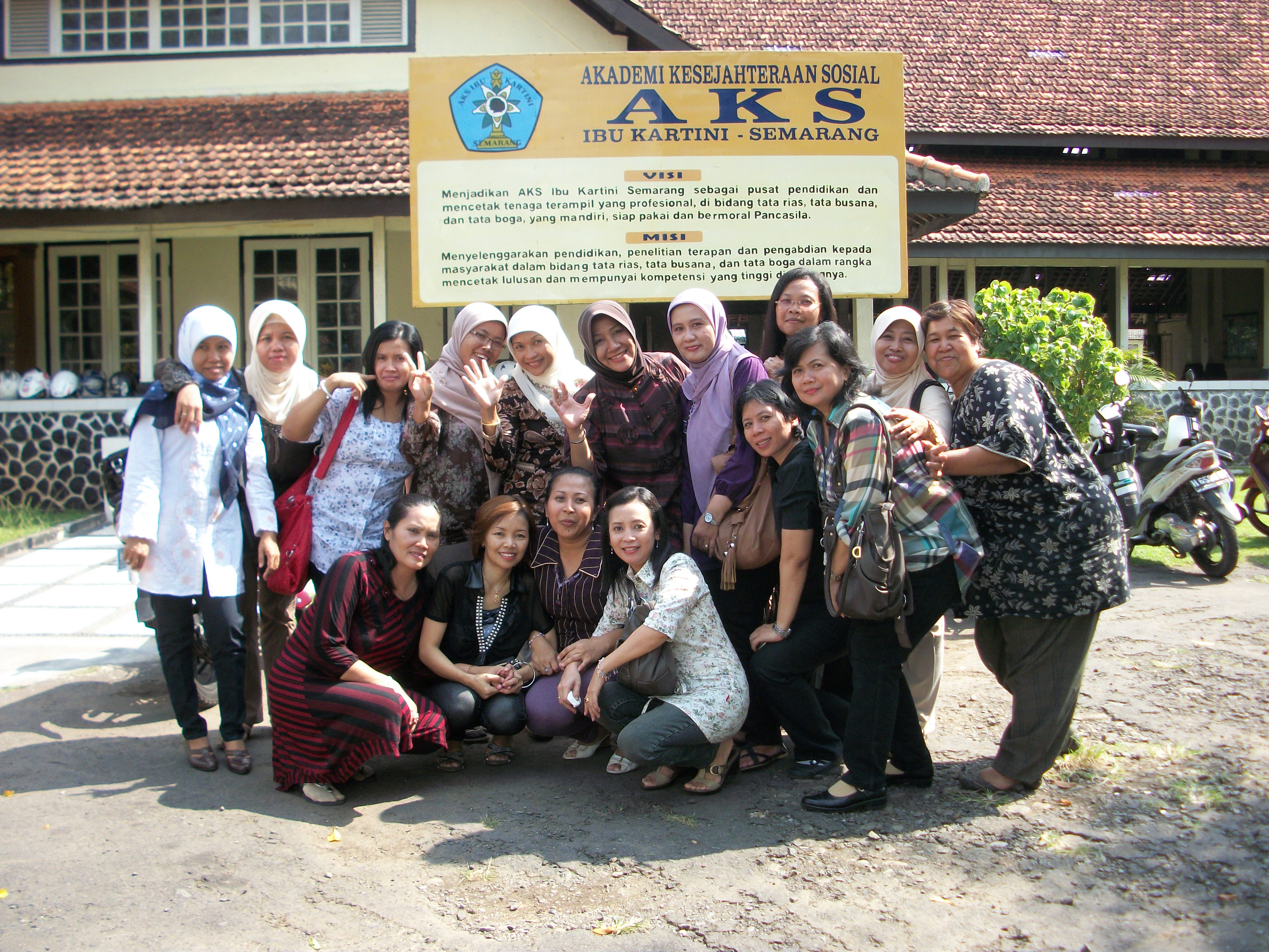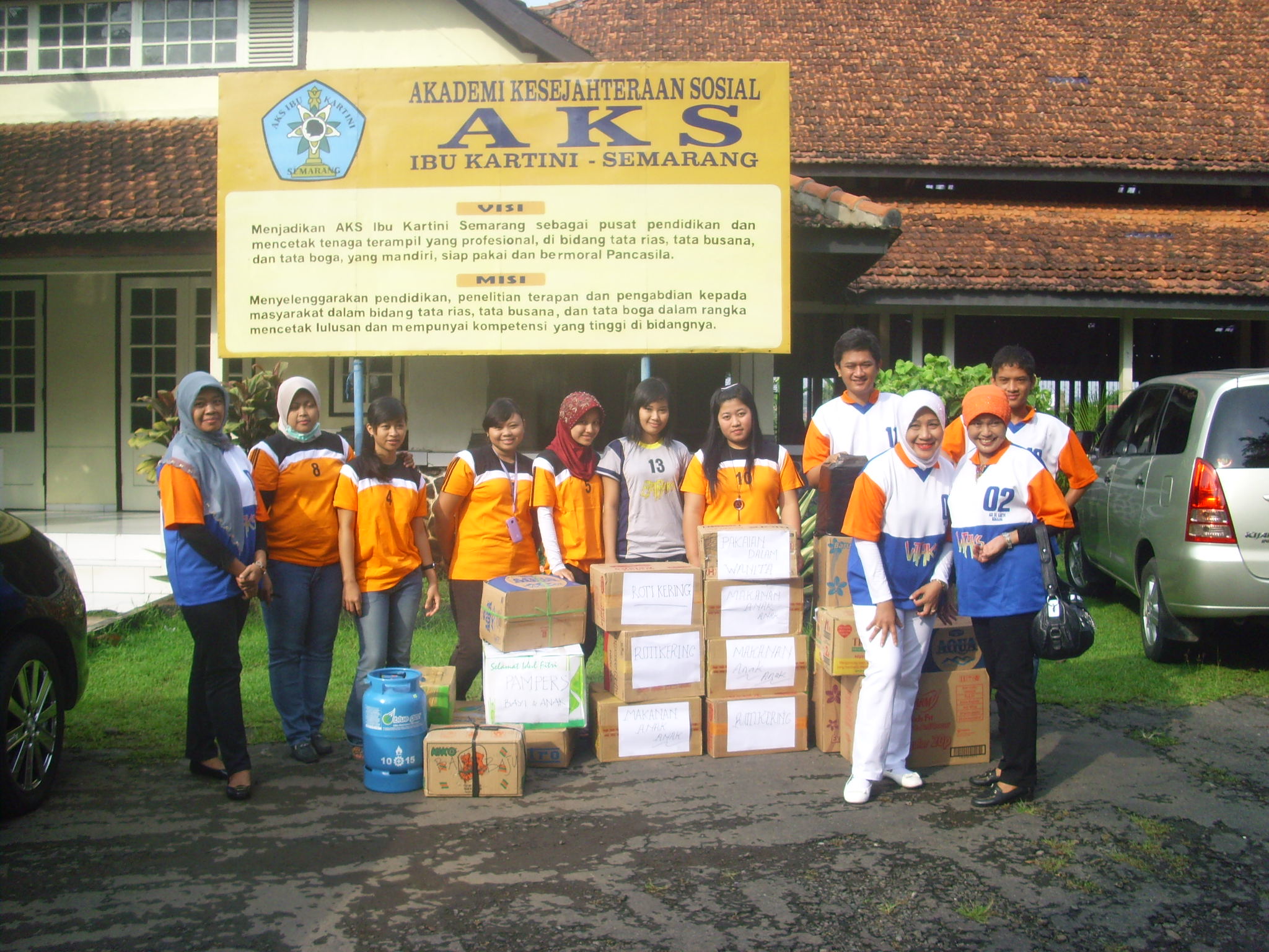 Tragedi penderitaan kembali menimpa bumi pertiwi Indonesia. Nampaknya Alam sedang tidak bersahabat dengan kita. Tanggal 26 Oktober 2010 dan lebih dari dua pekan Gunung Merapi sedang marah, memporak porandakan beberapa wilayah di Klaten, Boyolali, Magelang, dan Sleman. Puluhan bahkan seratus lebih korban manusia berjatuhan, belum lagi harta benda dan ternak warga yang banyak menjadi korban. Awan Panas Merapi yang disebut wedus gembel menerjang perkampungan warga tanpa memberi ampun, abu vulkanik menutupi wilayah yang tadinya begitu indah dan hijau, kini semua telah luluh lantah. Melihat dan mendengar seperti itu hati siapa yang tidak tergerak untuk membantu dan meringankan beban mereka. Berbagai bantuan dalam berbagai bentuk mengalir ke tempat pengungsian yang berada di sekitar Yogyakarta, Sleman, Klaten, Boyolali dan daerah sekitarnya. Beribu-ribu orang berada di pengungsian untuk menyelamatkan diri dari amukan Merapi. Dan mereka sangat berharap akan uluran tangan kita untuk meringankan beban mereka. Melihat keadaan ini AKS Ibu Kartini Semarang bertekad untuk membantu para pengungsi dengan menyumbangkan sedikit logistik dan tenaga yang diperlukan para pengungsi. Dengan penuh antusias dan keikhlasan hati kami bertekad untuk korban merapi dipengungsian. Tepatnya hari Rabu 3 November 2010, sebagai tahap awal kami mengumpulkan dana kemanusiaan dari para dosen, staf dan mahasiswa AKS Ibu Kartini Semarang. Pengumpulan sumbangan sukarela dilakukan selama 1 minggu. Begitu semangat semuanya terlibat dan bekerja untuk mendapatkan sumbangan bagi korban Merapi. Seminggu sudah berlalu, dan pengumpulan pun ditutup pada hari senin 8 November 2010. Hasil kotak sumbangan dibelanjakan kebutuhan hidup para pengungsi. Proses bhakti sosial tahap I sudah dilalui, dan berikutnya adalah rencana bhakti sosial di tempat pengungsian. Pada hari Selasa tanggal 9 November 2010 pukul 08.00 kami memutuskan berangkat ke tempat pengungsian di Klaten. Bantuan Logistik kami serahkan ke Kantor PMI setempat kemudian kami menuju ke kantor DPRD Kab. Klaten dimana para pengungsi berada. Di tempat tersebut diperkirakan terdapat 7.500 pengungsi. Setelah melihat-lihat situasi, kemudian tim relawan menuju ke dapur umum, untuk membantu memasak, membungkus nasi dan lain-lain. Misi pertama ditempat pengungsian adalah membungkus nasi untuk pengungsi, tanpa komando dan instruksi lebih lanjut, kami tim relawan mulai bergerak membungkus nasi. Waktu sungguh sangat cepat, siang berganti sore, sore berganti malam, cuaca pun tak menentu, hujan disertai petir. Listrikpun mati membuat situasi tambah tak menentu sementara pekerjaanpun belum selesai. Namun bukan menjadi penghalang bagi tim relawan AKS untuk putus asa, dengan berbekal senter dari HP, pekerjaan tetap dilakukan sampai malam. Karena tim relawan AKS cukup banyak dan ketrampilan membungkus nasi pun dapat dengan mudah dipelajari, menjadikan pekerjaan lebih lancar. Keesokan harinya tim relawan AKS kembali ke tempat pengungsian, dari pagi pukul 08.00 tim relawan sudah bergelut dengan nasi, sayur dan lauk. Bahkan para pimpinan AKS Ibu Kartini (Ibu Dra. Dyah Listyarini, SH,MH, dan para pembantu direktur) tak kalah dengan mahasiswanya, bekerja dengan penuh semangat dan antusias, malah beliau sangat cepat dan trampil sampai kami kewalahan. Para hari terakhir, tanggal 10 November 2010 pukul 14.30 tim relawan kembali ke Semarang setelah 3 hari 2 malam berada di pengungsian. Kenangan manis pahit kami bawa ke Semarang. Pengalaman capek, lelah, letih, lesu, kantuk menjadi pelajaran berharga bagi kami. Selamat tinggal saudara-saudaraku dipengungsian, kami selalu berdo’a untukmu……..